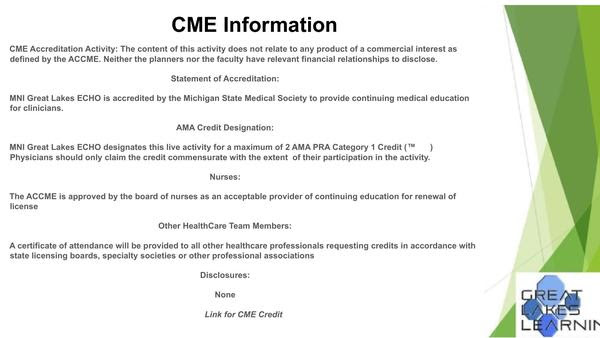 MNI Great Lakes ECHO designates this live activity for a maximum of 2 AMA PRA Category 1 Credit (™) Physicians should only claim the credit commensurate with the extent of their participation in the activity.